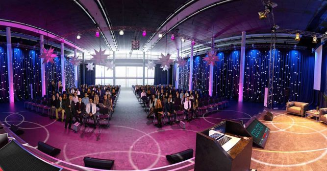 Virtual environments include a small conference room and a large auditorium with a 400-plus capacity with animated audience and noise.